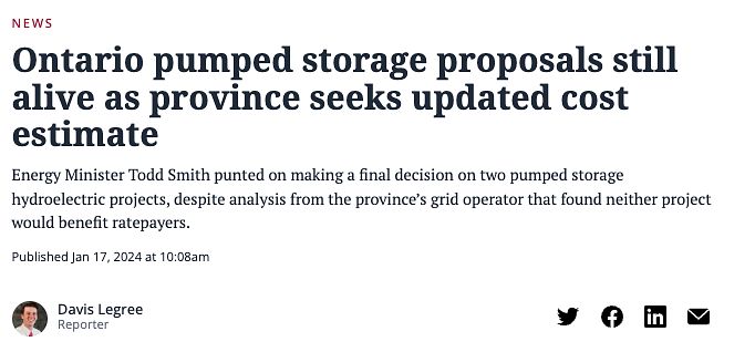Ontario pumped storage proposals still alive as province seeks updated cost estimate (2024; Quoted in iPolitics)