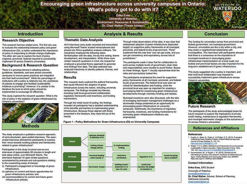 Eves, E. (2023). Encouraging green infrastructure across university campuses in Ontario: What’s policy got to do with it? [POSTER]. (C. W. (Supervisor), Ed.). University of Waterloo.